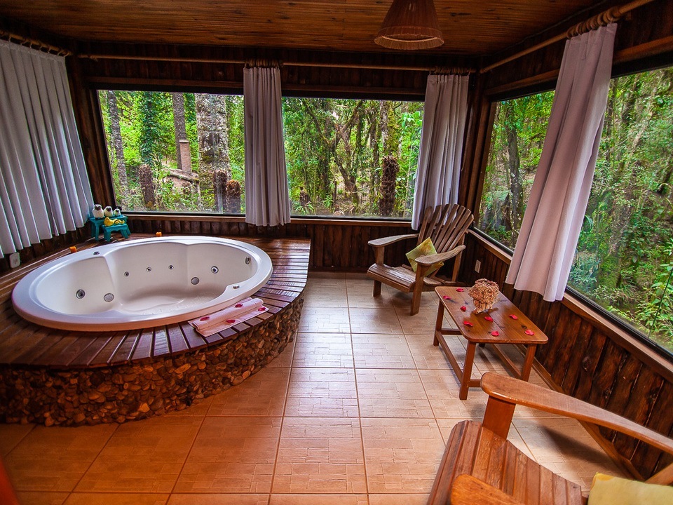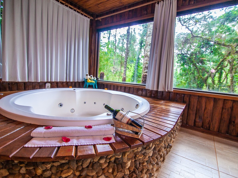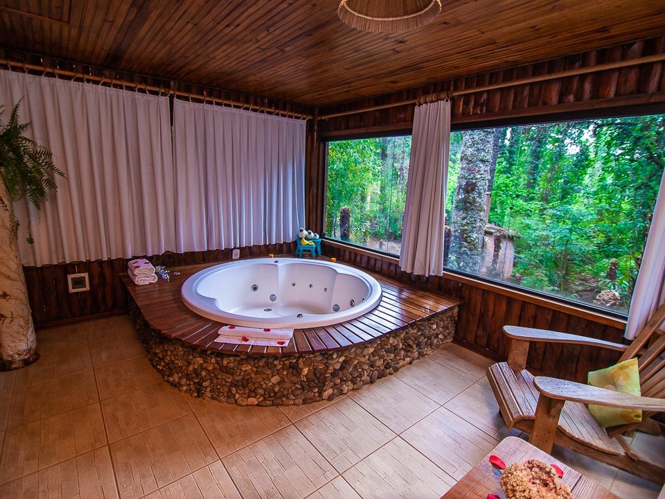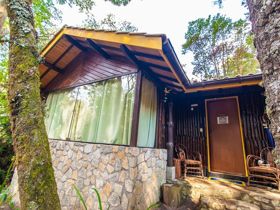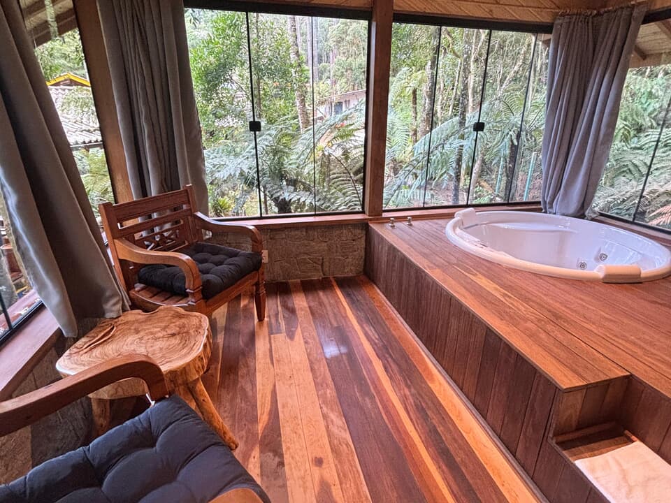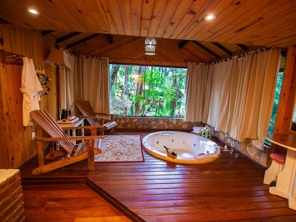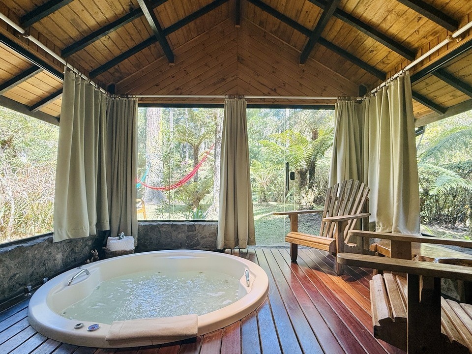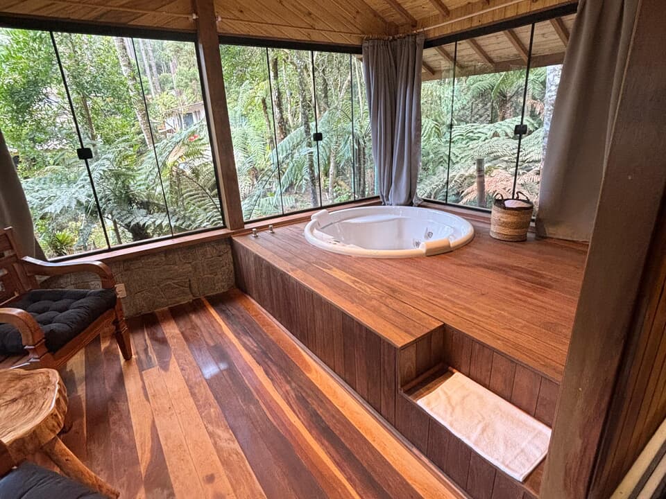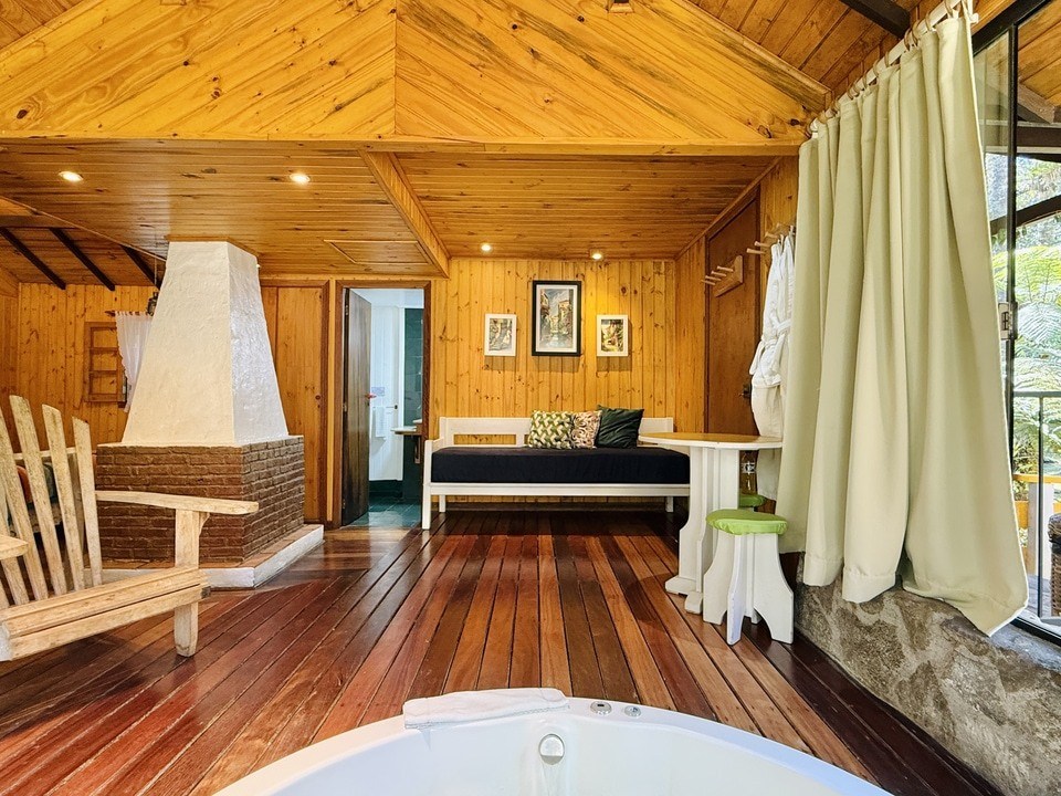 CABANA INCANTO - com 54m² de puro charme, a Cabana Incanto é um convite ao amor e ao descanso. Escondida em meio ao bosque e posicionada no alto, oferece uma vista deslumbrante entre as copas das árvores. A hidromassagem com vista para a natureza completa o cenário perfeito para momentos a dois, em um ambiente onde o silêncio, o verde e o aconchego compõem a trilha sonora ideal: uma verdadeira serenata para os sentidos.