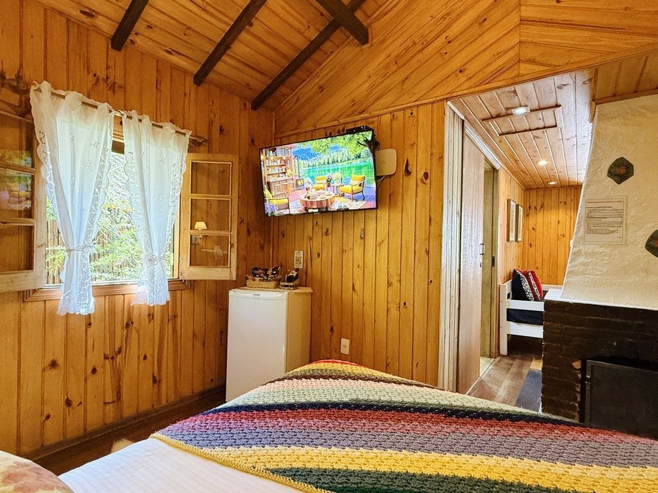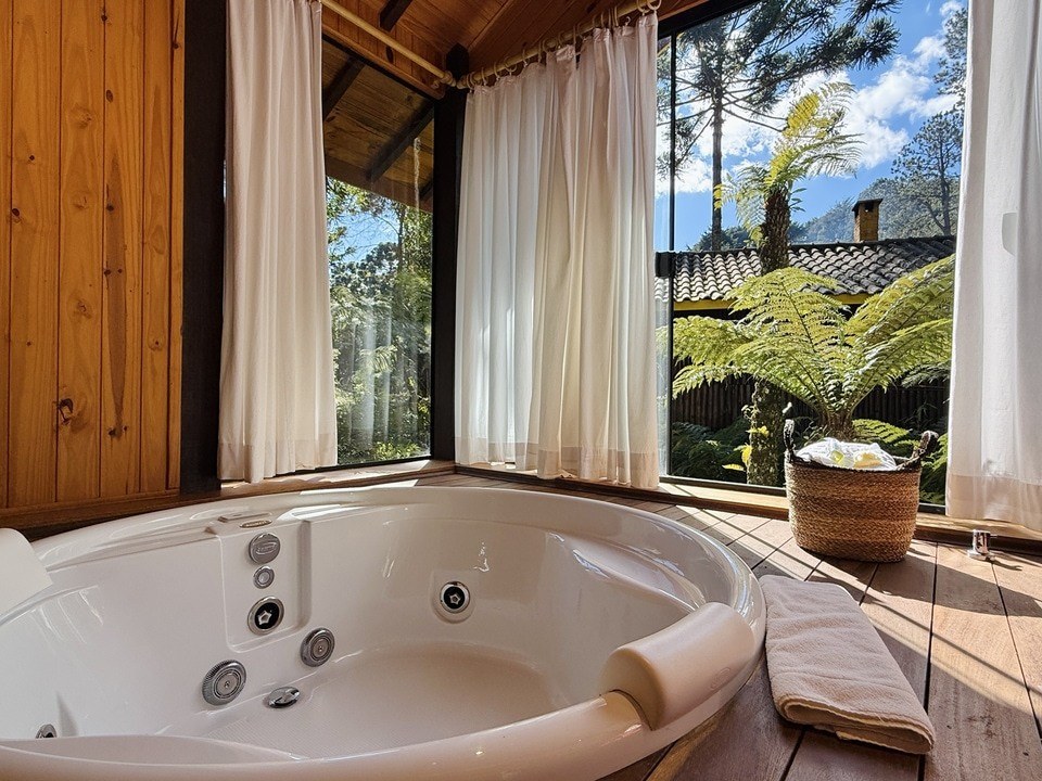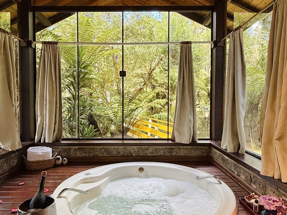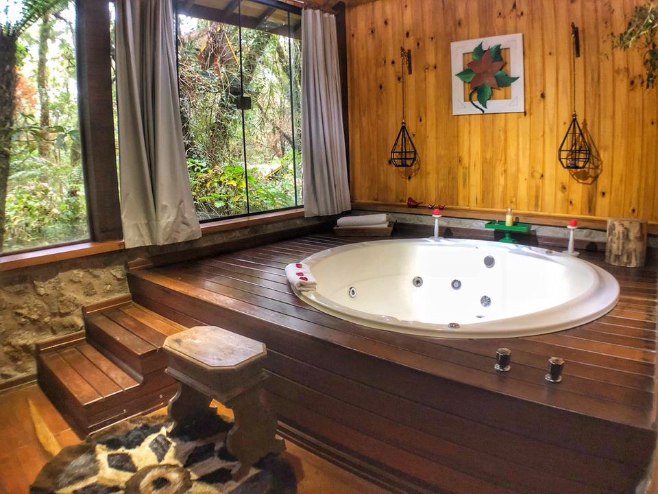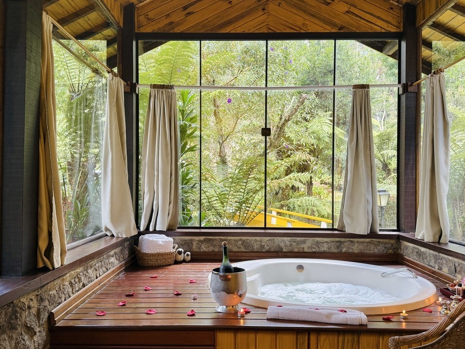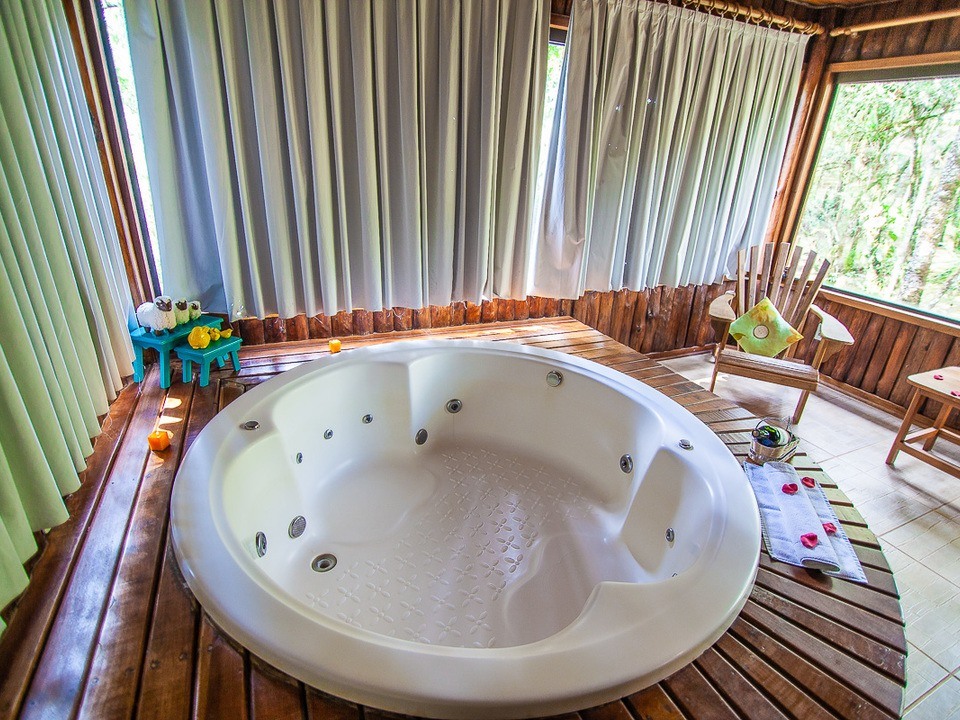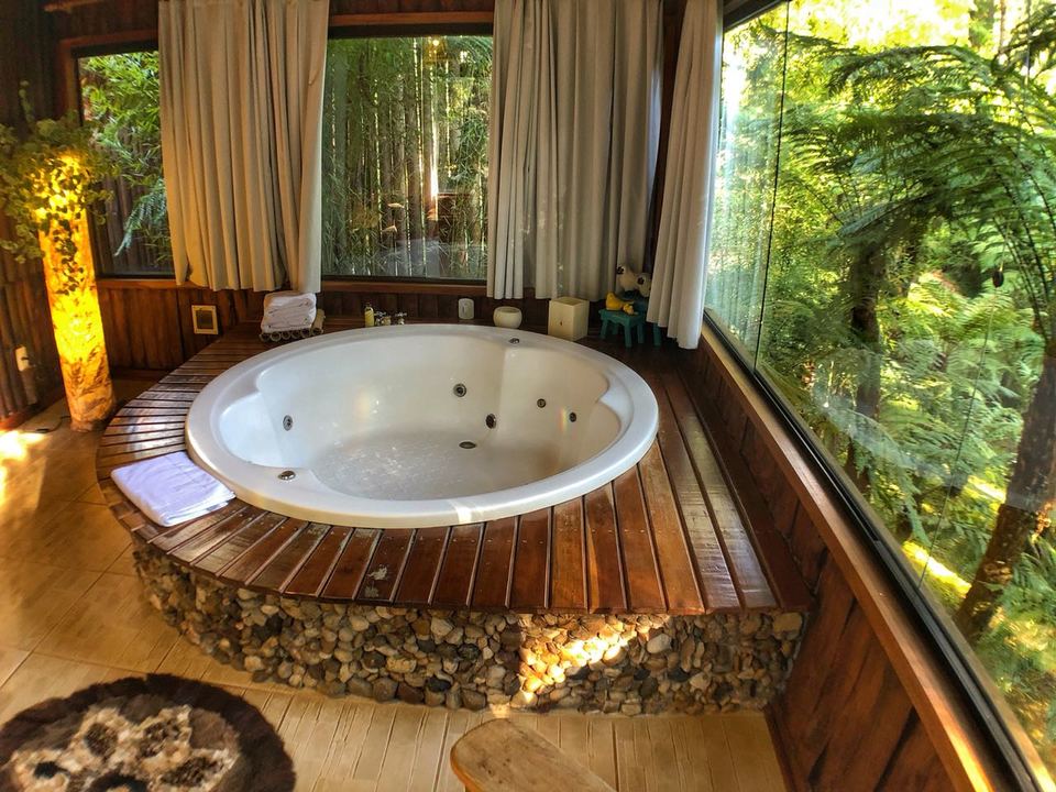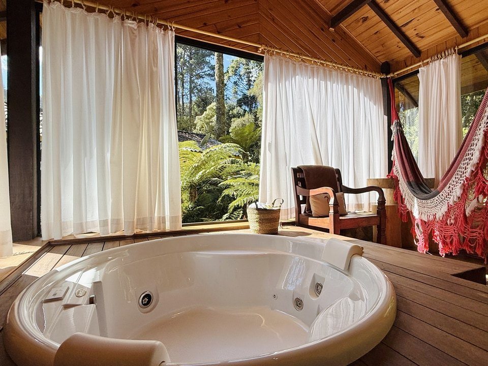CABANA INCANTO - com 54m² de puro charme, a Cabana Incanto é um convite ao amor e ao descanso. Escondida em meio ao bosque e posicionada no alto, oferece uma vista deslumbrante entre as copas das árvores. A hidromassagem com vista para a natureza completa o cenário perfeito para momentos a dois, em um ambiente onde o silêncio, o verde e o aconchego compõem a trilha sonora ideal: uma verdadeira serenata para os sentidos.