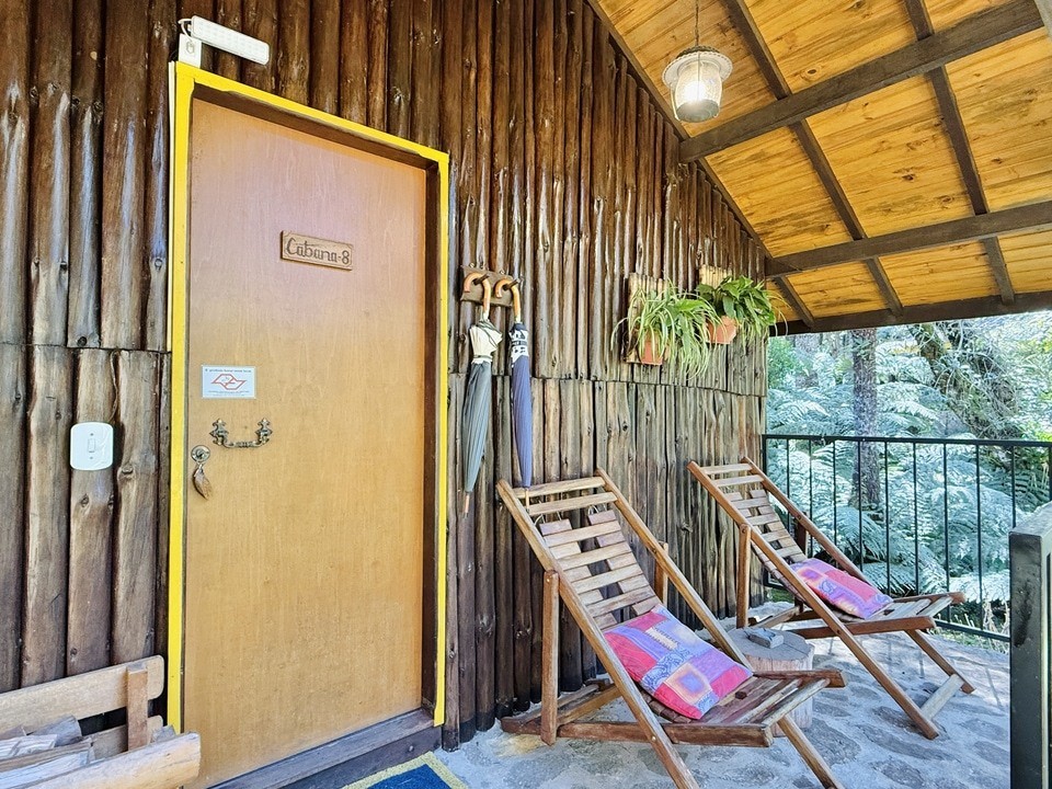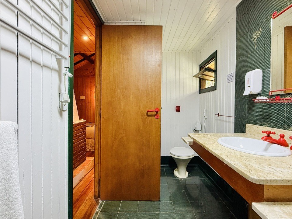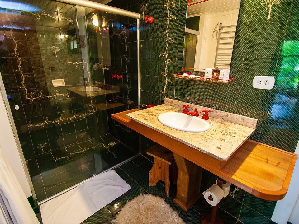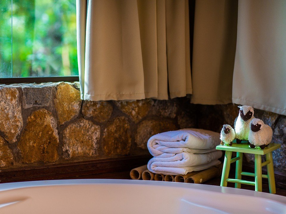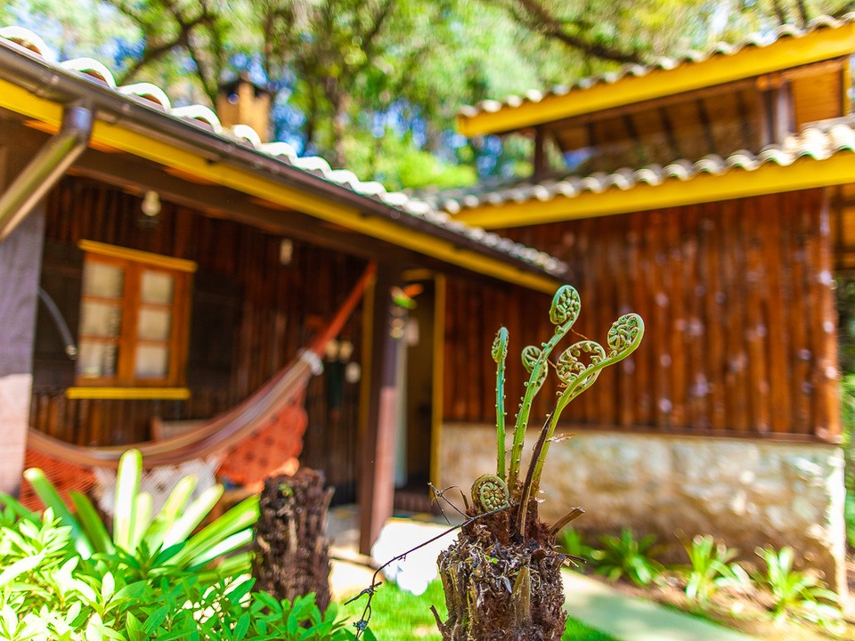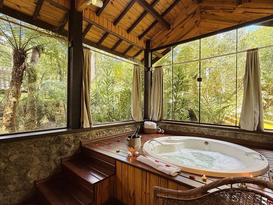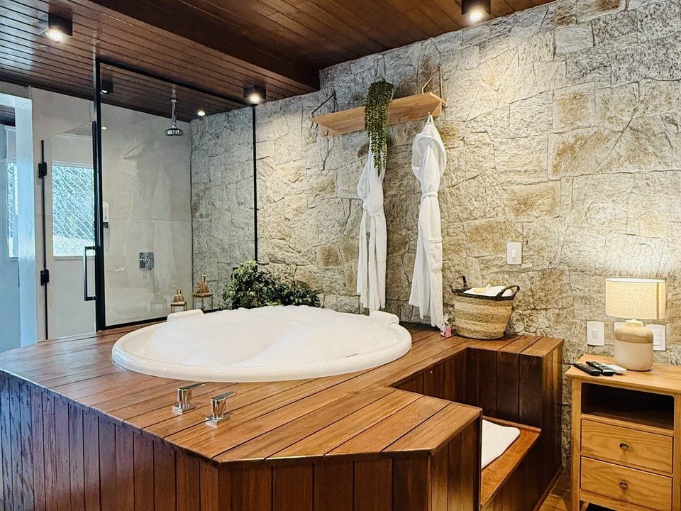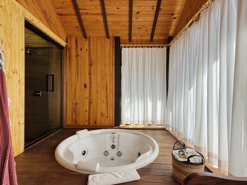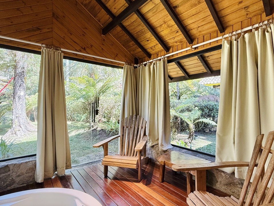 CABANA INCANTO - com 54m² de puro charme, a Cabana Incanto é um convite ao amor e ao descanso. Escondida em meio ao bosque e posicionada no alto, oferece uma vista deslumbrante entre as copas das árvores. A hidromassagem com vista para a natureza completa o cenário perfeito para momentos a dois, em um ambiente onde o silêncio, o verde e o aconchego compõem a trilha sonora ideal: uma verdadeira serenata para os sentidos.
