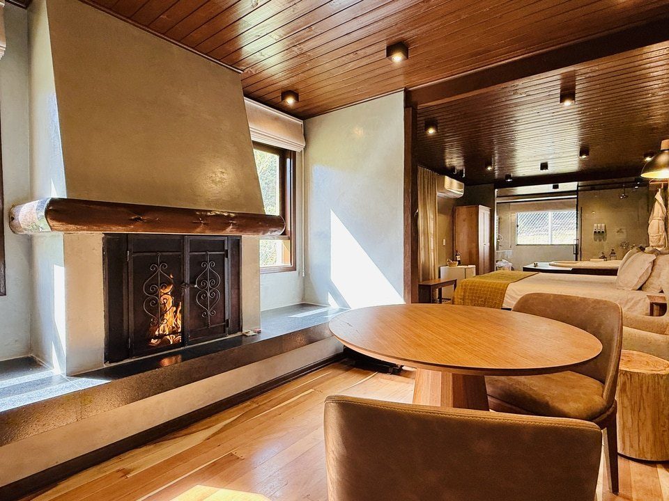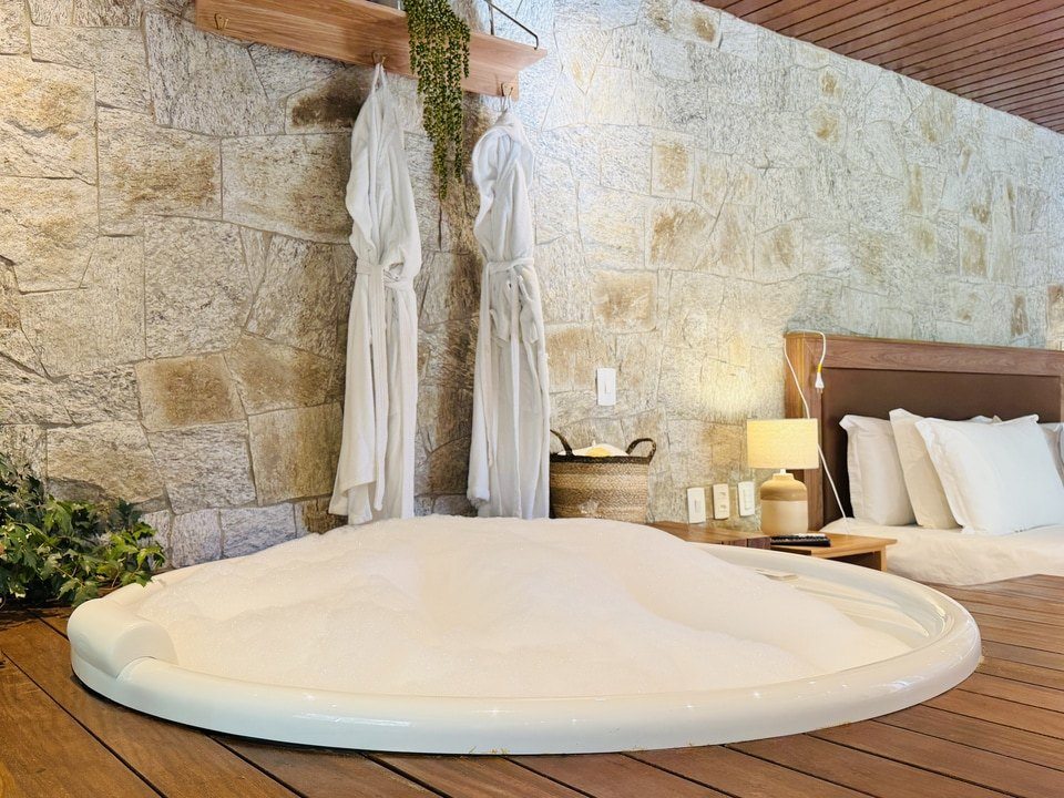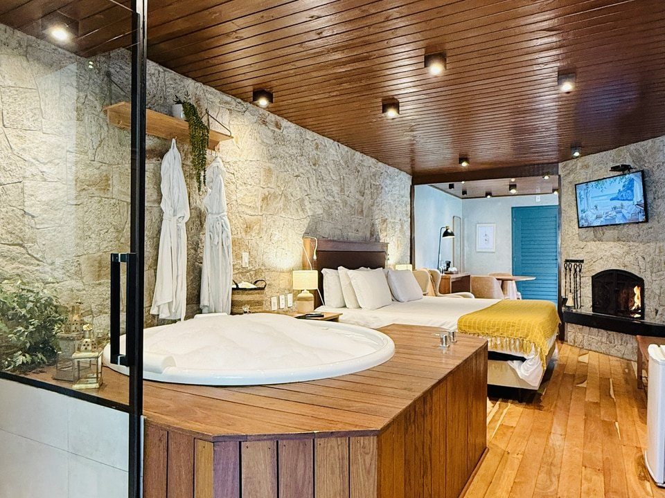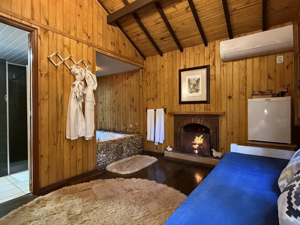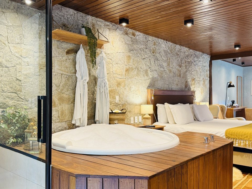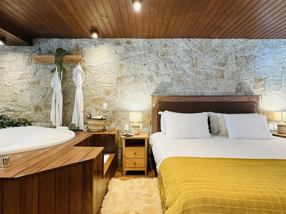 A Cabana Rifugio com hidromassagem é um retiro sereno, a maior (62m²) e mais isolada das Cabanas, onde o rústico encontra o luxo. O ambiente acolhedor é acentuado por tons de madeira natural e pedra, criando uma conexão harmoniosa com a natureza ao redor. A espaçosa hidromassagem oferece uma experiência relaxante, enquanto a grande janela proporciona vistas deslumbrantes para o exterior. Detalhes artesanais e uma lareira acolhedora, criam uma atmosfera calorosa e acolhedora. Esta cabana proporciona uma fuga íntima e indulgente, ideal para quem busca tranquilidade e conforto.