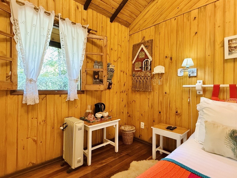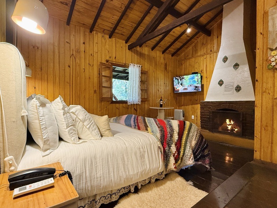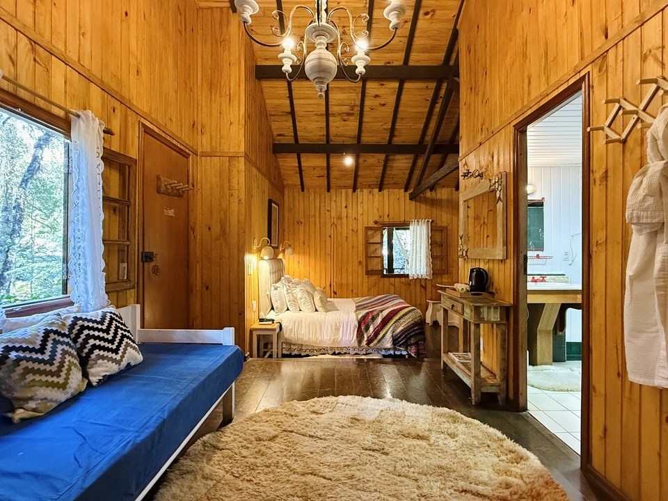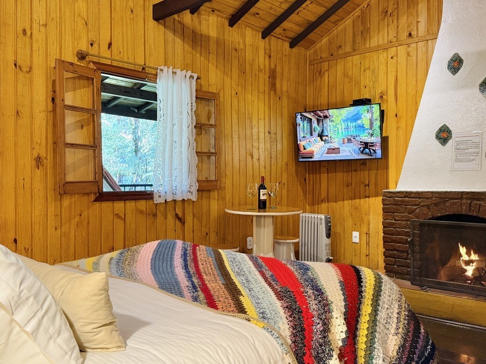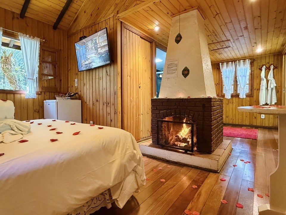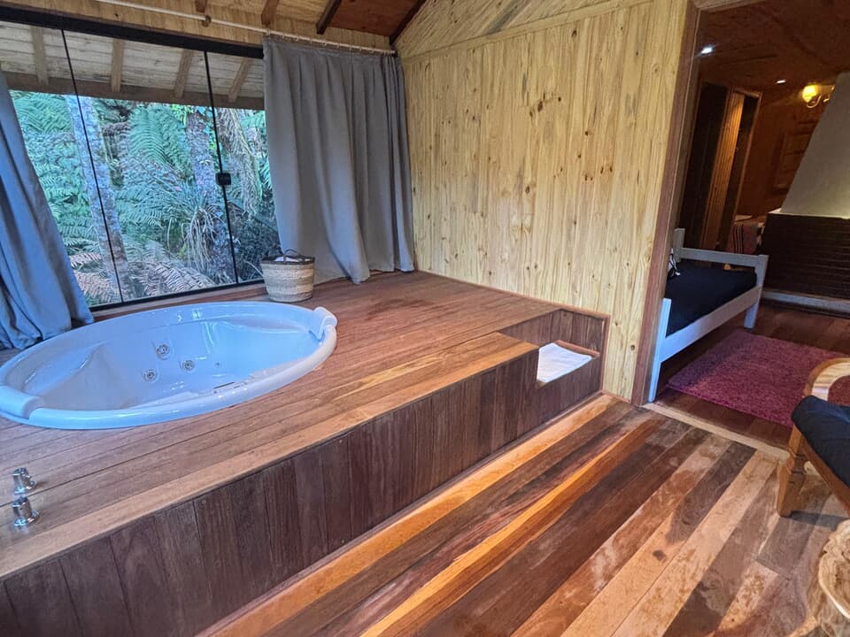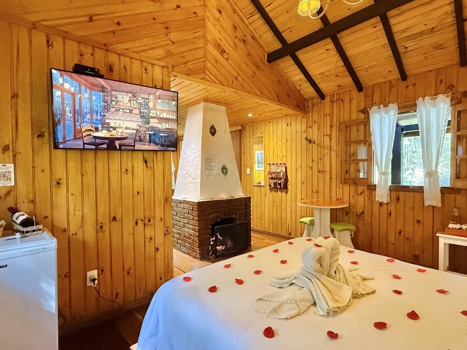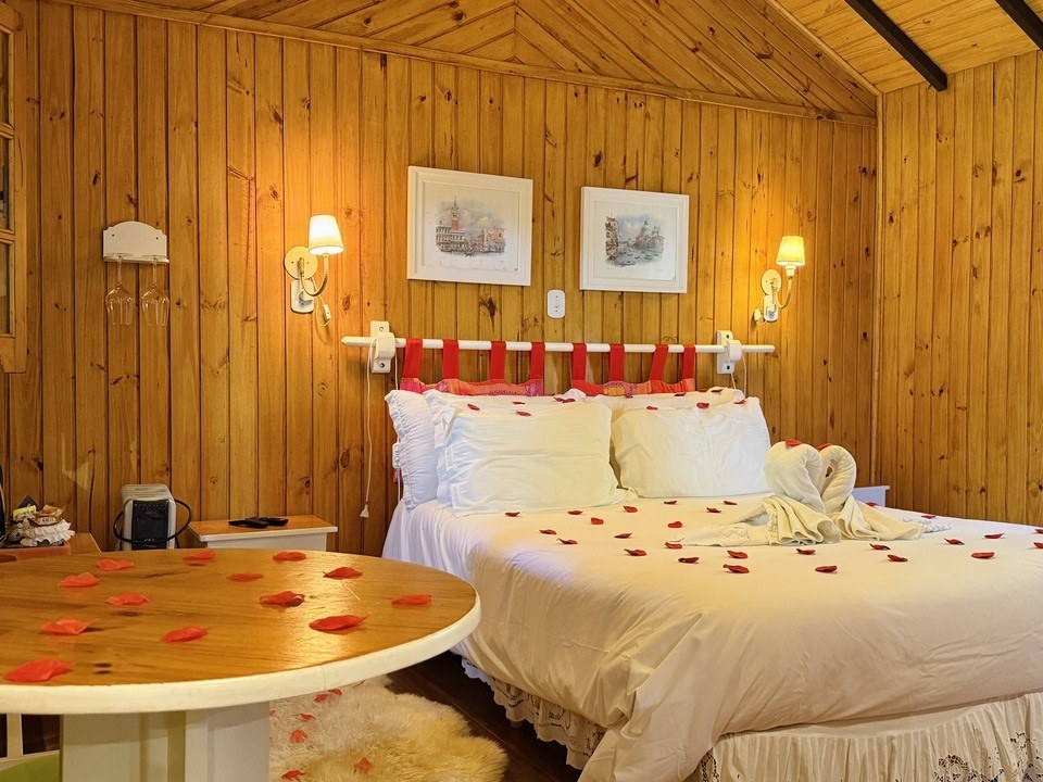 Cabana Bacio — um refúgio de 50m² onde cada momento é um convite ao afeto. Relaxe na hidro com vista para o riacho e o bosque, enquanto o sussurrar da natureza embala seus encontros mais apaixonados. Um lugar para viver o amor em sua forma mais pura. ❤️