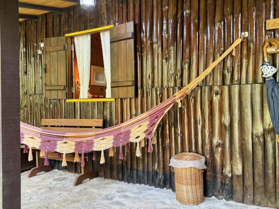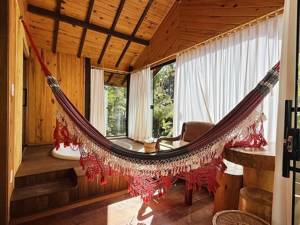 Cabana Gioia — Gioia significa alegria em italiano, e aqui ela se revela em cada detalhe. Um refúgio de 50m² feito para corações que amam com leveza. A hidro convida a brindar o amor com vista para o bosque, enquanto o riacho sussurra segredos ao fundo. Na varanda, a rede embala dois corpos que descansam juntos, em silêncio ou riso. Um lugar onde o tempo desacelera e o amor encontra espaço para florescer. 💛